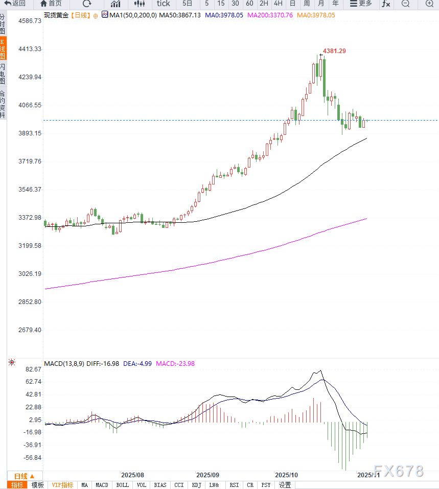 从黄金日线结构来看,金价近期在4000美元整数关口附近受阻,连续多日回调,目前下探至 3950–3970 美元区间支撑带。K线运行在 20 日均线下方,且 MACD 动能柱持续减弱,显示短线趋势偏弱。